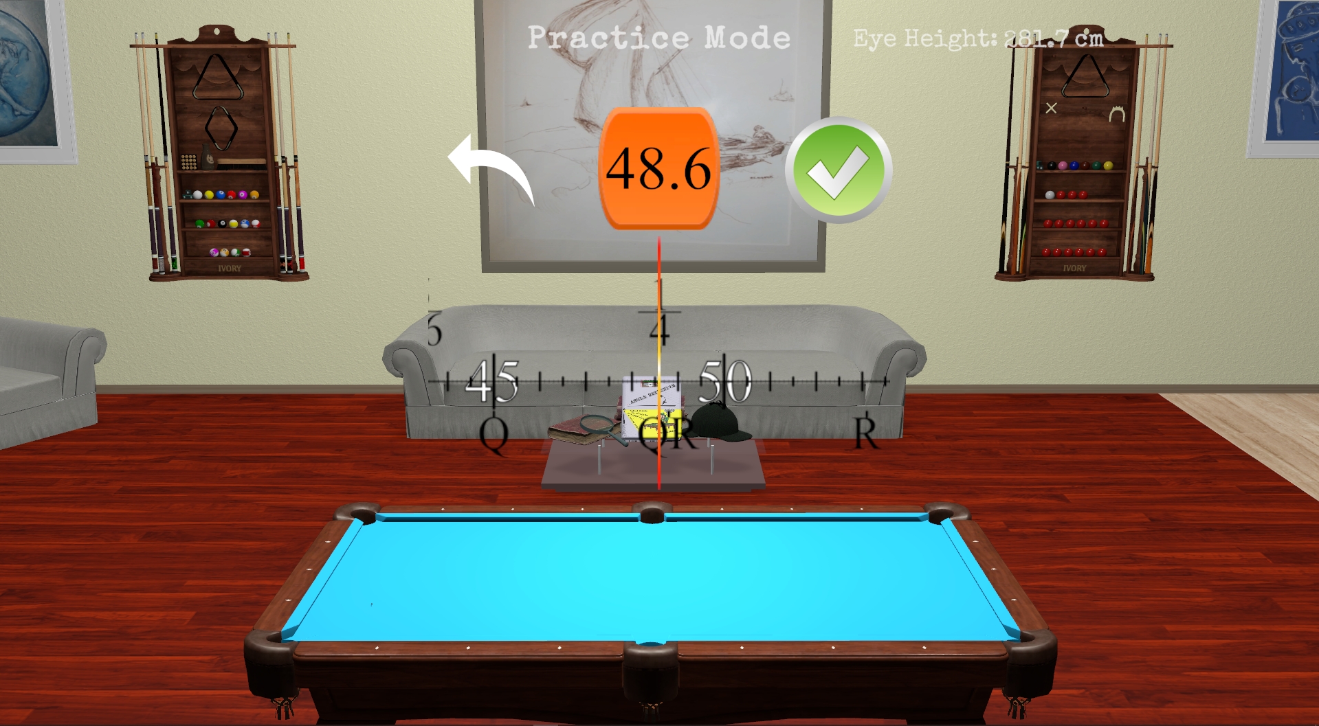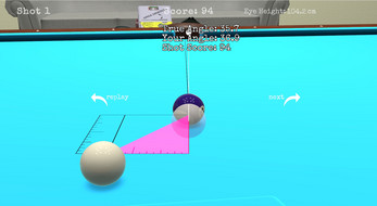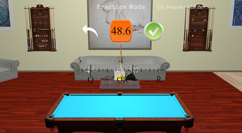 Choose any angle from 0°–90° (in 0.1° increments) and the game continuously generates geometrically accurate randomized layouts at that exact angle — ideal for deeply ingraining angle recognition. You can even raise or lower the view to match your real-life eye height, then click through shot after shot while the view remains at the same height you would have at a real table.